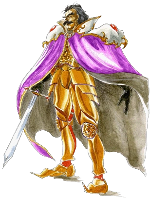 Es un hombre de 52 años. Tiene el cabello largo y oscuro, y un mostacho. Lleva puesta una armadura dorada, con una capa violeta encima y hombreras plateadas con detalles en oro y gemas rojas en el centro.