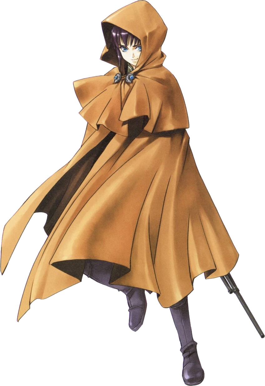 Cathari has dark purple hair and blue eyes. She wears a kaki outfit and grey pants. She also wears a large orange cloak. Her weapon of choice is a gun.