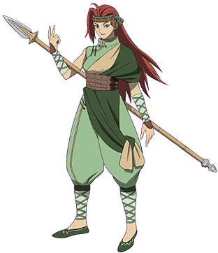 Chein is a red haired woman with a stripe blue and orange colored headband on her head. She wears a green chinese clothes and a doll shoes on her foot.