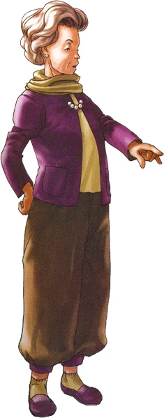 Deborah is an old woman with grey hair. She wears a kaki scarf, a purple coat and brown pant.