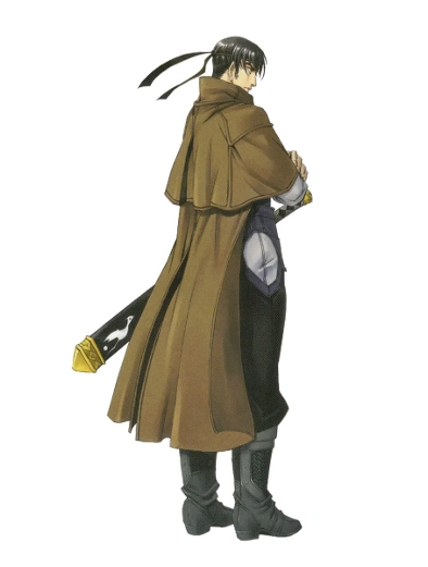 In Suikoden V, he wears a traditional short sleeve black tunic with yellow triangle designs in each side of his sleeves and the edge of his tunic, underneath is a white long sleeve kimono shirt and has baggy sleeves below his arms and a black undershirt, white pants and black boots with yellow triangle designs. He also wears matching black gauntlets with yellow outlines.