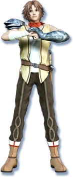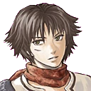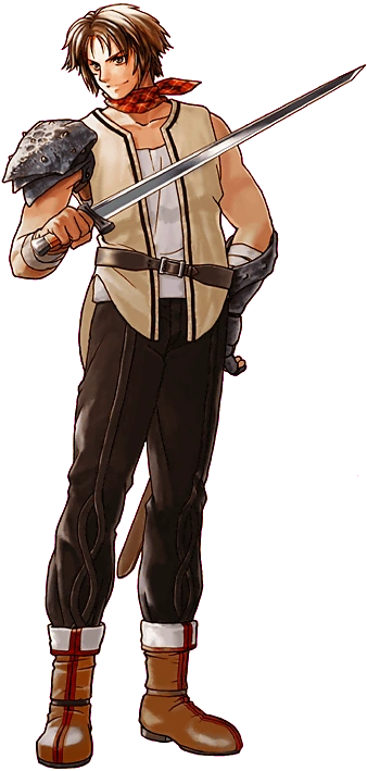 In Suikoden IV, he appeared to have a brown eyes with brown hair and scar on his right cheek. He wears a red bandana and he uses a sword.