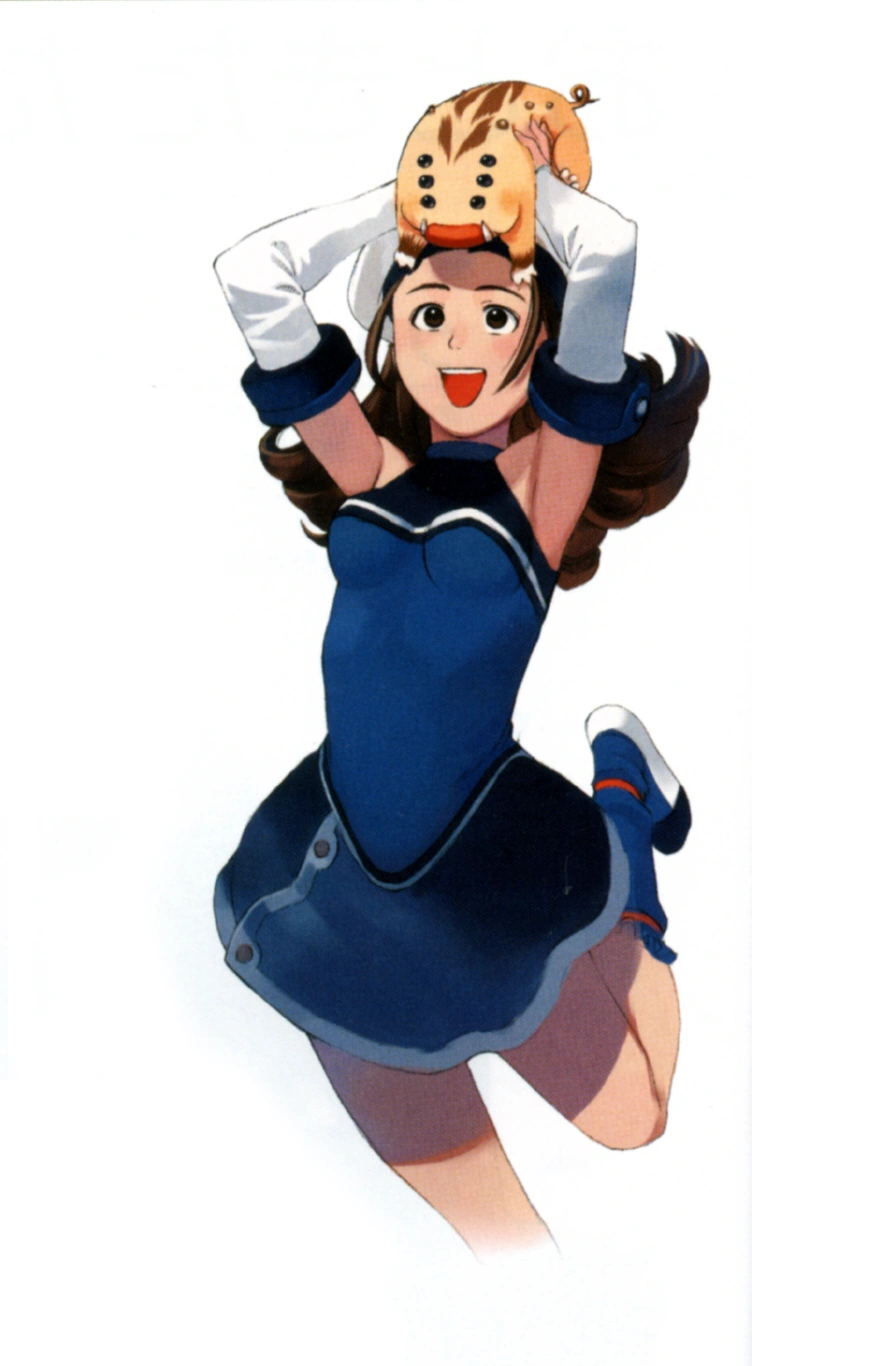 Millie has brown long hair, brown eyes and wears a white and blue hat. She also wears a blue dress. Her weapon of choice is a boomerang.