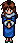 She wears a blue dress and has dark brown hair.